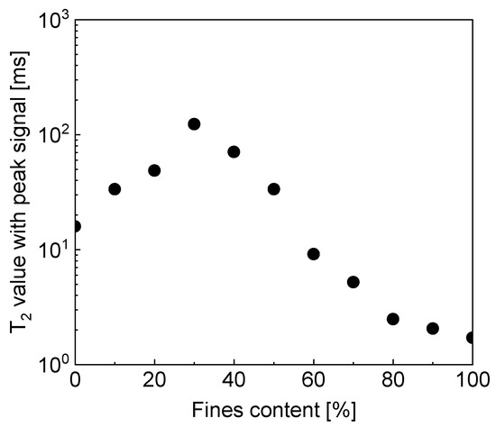 Relationship between fines content and T2 value of peak signal.