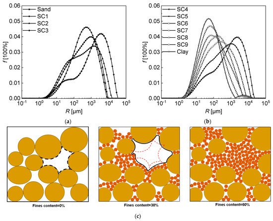 Pore size distribution curves of composite soils with different fines content: (a) 0~30%; (b) 40~100%; (c) schematic diagram for the effect of fines content on the pore size distribution.