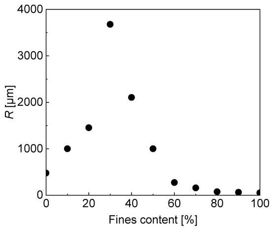 To analyze the influence of fines content on the particle size distribution quantitatively, the optimal pore size in the pore size distribution curve is used for discussion. The dominant pore size of the composite soil obtained under different fines content is plotted in Figure 8. From the figure, it can be seen that for lower fines content, the dominant pore size first increases with the increase in fines content. The maximum value is reached when the fines content reaches 30%, corresponding to the strongest local honeycomb pore structure. As the fines content further increases, the number of small pores increases while the number of large pores decreases, and the dominant pore size rapidly decreases. When the fines content exceeds 60–70%, the dominant pore size almost no longer changes. At this point, the soil becomes a cohesive soil, where the coarse particles are wrapped by fine particles, and the fines content has little effect on the size of the dominant pore size.