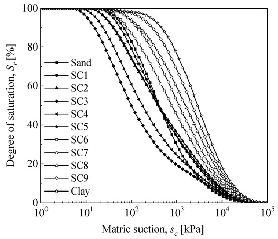 where sc is the matric suction, γ is the air-water surface tension, and R is the pore radius. At 20 °C, the air–water surface tension is 72.8 J/m2. From the above equation, it can be seen that the matric suction of the soil sample is inversely proportional to the pore radius. Therefore, during the drying process, when the matric suction gradually increases, the larger pores first drain, and then the smaller pores gradually begin to drain. Under a certain matric suction, there is a pore size corresponding to the matric suction value. Pores larger than this size are assumed to have already completely drained, while pores smaller than this size are assumed to be fully saturated. Therefore, for a given matric suction, the corresponding degree of saturation can be obtained by integrating the pore size distribution curve from the smallest pore to the pore size corresponding to that suction: