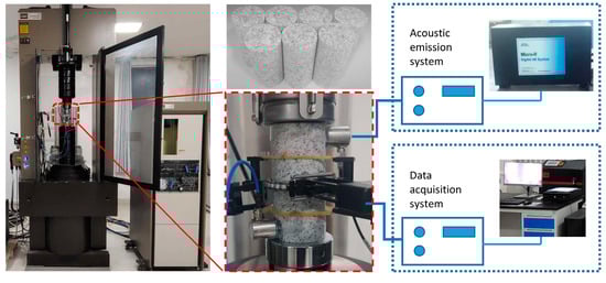 The experiment was carried out using the MTS815 Flex Test GT (MTS Industrial Systems Co., Ltd., Shanghai, China) electrohydraulic servo rock mechanics experimental system at North China University of Water Resources and Electric Power in China, as shown in Figure 1, which can measure the axial and radial deformation of a specimen in real time, record the load, stress, displacement and strain values, and simultaneously plot the load-displacement and stress-strain curves. Acoustic emission data were acquired by using the PCI-II acoustic emission (AE) monitoring system (Physical Acoustics Company Beijing Office, Beijing, China) from the American Physical Acoustic Corporation (PAC). The MTS815 Flex Test GT electrohydraulic servo rock mechanics experimental system used in the experiment is regularly maintained and calibrated by a qualified professional organization to ensure that it is in good working condition. Prior to the start of the experiment, the AE monitoring system was tested in a broken-lead experiment, and the monitoring results were accurate.