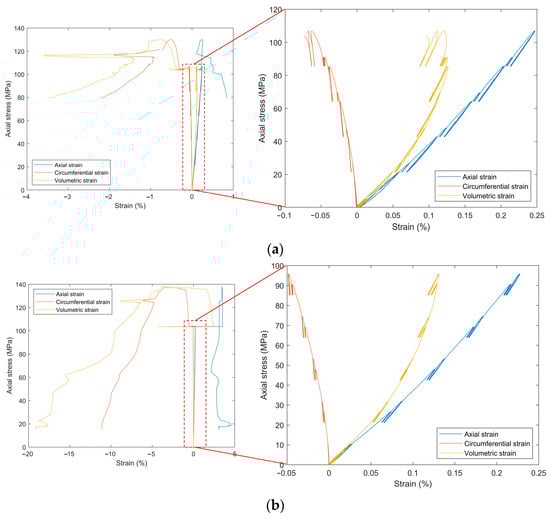 An interesting phenomenon is also observed in Figure 5: under extreme stress, the loading deformation modulus of the granite sample decreased by approximately 5–13% compared to that under a low-amplitude cyclic load at the same stress level, and the unloaded deformation modulus did not change significantly. This phenomenon occurred because is only related to elastic strain, and is affected not only by elastic strain but also by plastic strain. Under extreme stress, the microcracks expand, intersect, or even penetrate through the rock sample, resulting in a large plastic strain, which leads to a significant decrease in under extreme stress.