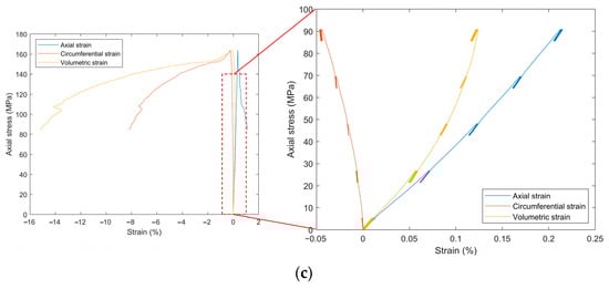 First, it should be noted that the magnitude of macroscopic deformation increases when cracks in the rock develop; thus, macroscopic deformation can be regarded as an intuitive reflection of rock damage. Additionally, the opening of some cracks and the closing of other cracks occur at the same time. Since axial deformation is not only a measure of the development of internal cracks but also a measure of the closure of internal cracks, annular deformation can better reflect the development process of rock damage than can the axial deformation.
