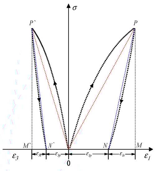 In the plot of the stress-axial strain curve, if the slope of line OP between the starting point O and the loading end point P of a cycle is defined as the loading deformation modulus , then it includes the axial elastic strain and plastic strain. Similarly, the slope of the line PN between the loading endpoint P and the unloading endpoint N of a cycle is defined as the unloading deformation modulus , which includes only the axial elastic strain . These values can be calculated by using the following formulas: