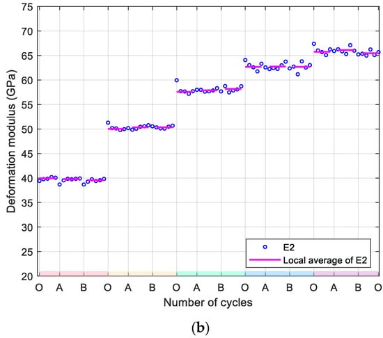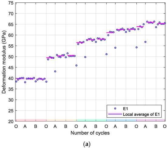 Figure 5 shows the deformation modulus of the granite specimens in Case 1. Notably, point O represents the starting point of each stress stage, and points A and B are the two stress extremes in the stage. During the rock loading-unloading cycle, the loading deformation modulus is slightly smaller than the unloading deformation modulus due to the influence of plastic deformation. As the cyclic load gradient increases, both the loading deformation modulus and the unloading deformation modulus of the granite specimens increase continuously in the form of a gradual slope. This trend is similar to the results obtained in cyclic loading tests of general rock [].