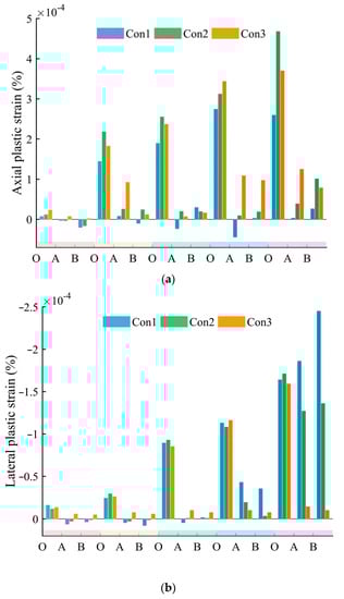 Plastic strain associated with loading and unloading during low-amplitude cycling. (a) Axial plastic strain; (b) hoop plastic strain. The different colors in the bottom of the figure represent the stress levels from stage1 to stage5.
