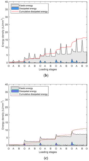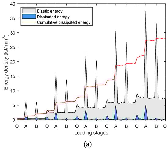 According to the uniaxial cyclic loading and unloading stress-strain curve, the variations in the elastic energy density and dissipated energy density of granite can be obtained as shown in Figure 8. The dissipated energy density of the rock in the first few cycles of each stress level (the OA segment) is highest because when the rock is subjected to a load exceeding the maximum historical stress for the first time, the local stress leads to changes in the microcracks in the rock, causing energy dissipation. In addition, although the amplitude of the cyclic loads applied in the OA section is 10 kN, the magnitude of the dissipation work and the absolute value of the axial force are significantly correlated, suggesting that the stress level of the cyclic load significantly affects the evolution and expansion of the microcracks in the rock.