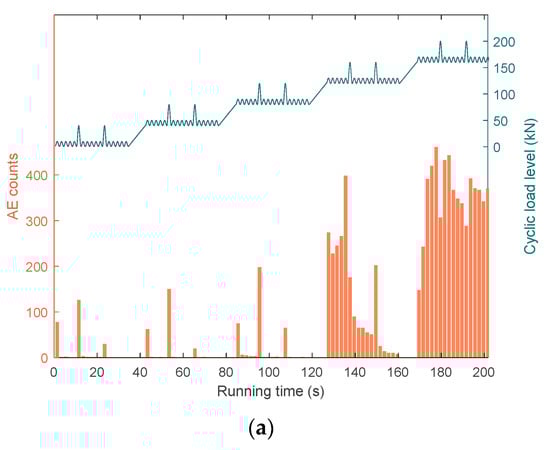 Figure 9 shows the number of acoustic emission events under three sets of working conditions with different extreme stress levels. Figure 10 shows the corresponding acoustic emission event energy. Since the acoustic emission energy varies greatly and spans multiple orders of magnitude, for clarity, the distribution range of the absolute energy is provided in logarithmic form.