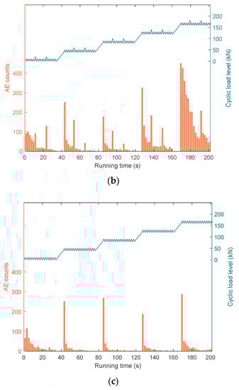Number of acoustic emission events for three working conditions with different extreme stress levels. (a) Condition 1; (b) condition 2; (c) condition 3.