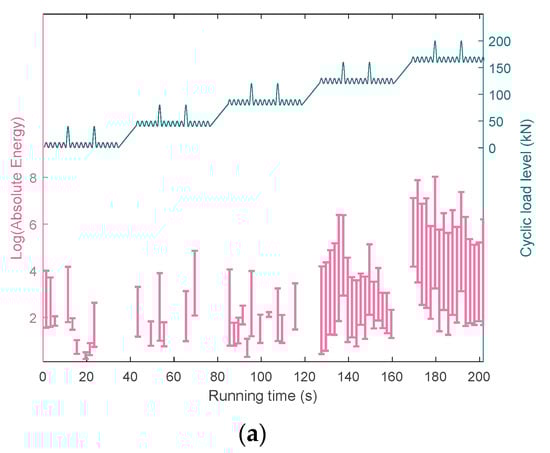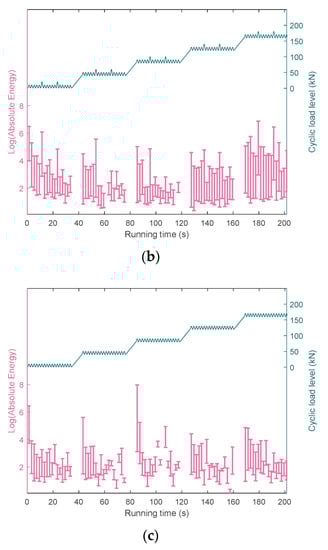 Absolute energy of acoustic emission events for three working conditions with different stress extremes. (a) Condition 1; (b) condition 2; (c) condition 3.