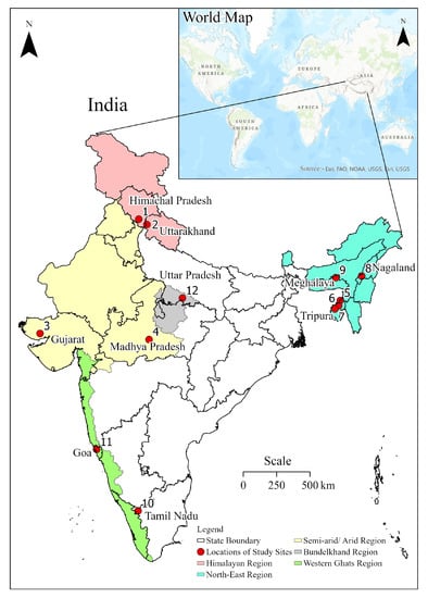 The northeastern region of India (Figure 1) receives very high rainfall. Tripura, a constituent state of the northeastern region of India, receives an average annual rainfall of 2390 mm, of which 60% is received from June to September [26]. Orchards or commercial farms of horticultural crops do not exist in Tripura; most of the fruits and vegetables are produced at homestead plots where cultivation primarily occurs for domestic consumption. Similarly, in the adjoining state of Nagaland, the agricultural activities are largely dependent on the southwest monsoon, and the state has faced many drought or drought-like situations in the past few decades. The small and marginal farmers (85%) of the region usually concentrate on monocropping rice and mixed cropping in hilly slopes. Another state of northeastern India, Meghalaya, despite receiving the world’s highest rainfall (in the Mausamgram village), still faces problems of water scarcity during post monsoon periods that ultimately affects the agricultural activities in the state. In these northeastern states, despite of the high rainfall, water scarcity exists during the post-monsoon period.