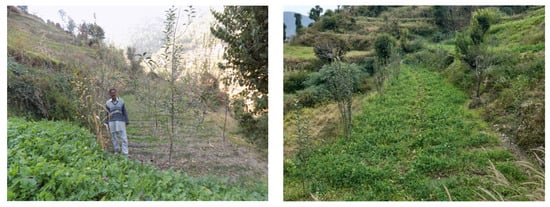 (b) The Sahiya-Udpalta village, located at a latitude of 30°36′20″ N, longitude of 77°51′42″ E, and elevation of 1523 m MSL in the Dehradun district of Uttarakhand state, was used for the study. Climate of the area is sub-temperate, showing a prominent winter season with the average maximum and minimum temperatures of 38 and 1 °C, respectively. Rainfall is 1100 mm, the majority of which is received during monsoon season. In winter, the region receives snowfall. The soil has a silty loam texture.