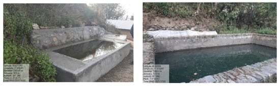 A few natural springs are present in the area due to existence of mountainous terrain, which supplies water throughout the year. Looking at the perennial availability of springs’ water, few springs are selected in this study for utilizing their water for vegetable production. One of the selected perennial springs, located 4 km away from the village toward the upper reach, has a discharge of 2 L s−1. The spring water is diverted to a chamber constructed near the spring, which later conveys the water to a tank constructed at farmer’s field through a 1-inch diameter high-density polyethylene (HDPE) pipe over a distance of 4 km. Similarly, water from five other perennial springs is tapped (Figure 4). The developed water resources are utilized for raising vegetable crops, i.e., tomato, cucumber, onion, and chickpea, and to meet the domestic water requirements.