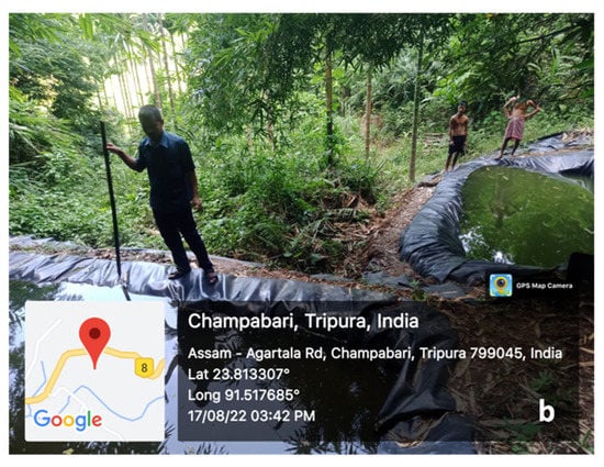 In Hathai Kotor village with undulating topographic terrain, highlands (locally called tilla) are used for residential purposes, while the low-lying plain areas are used for paddy and fish cultivation using water supplied from the constructed ponds. Apart from the rains, the major source of water for cultivation of paddy and fish is the Howrah River. The water ponds are mainly located in the low-lying areas, and thus, these are unable to supply water for irrigation and domestic needs of homestead plots located in the highlands. Consequently, a large proportion of area in highlands remains uncropped or under-cropped. To circumvent this issue, plastic-lined rainfed ponds (jalkunds) with capacities ranging from 10,000 to 30,000 L were introduced in the highlands for irrigation (Figure 10). The ponds were constructed at the highest altitude in farmers’ fields under shaded or sheltered pockets to minimize evaporation loss. The natural gradient of the pond sites was utilized for irrigating horticultural crops in the middle altitudes using the gravity flow of water, thus avoiding the need for energy for water conveyance.