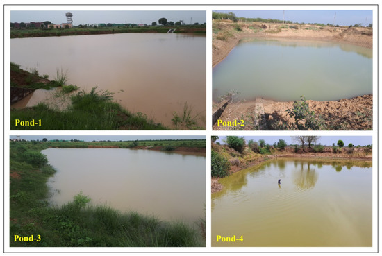 In the study area, four farm ponds of the dugout-cum-embankment type were constructed in the year 2016 (Figure 16). The storage capacity of the 1st, 2nd, 3rd, and 4th ponds is 10,500, 7040, 20,000, and 24,000 m3, respectively, with a total of 61,540 m3. Water stored in the ponds has been used for irrigating winter season crops as well as fulfilling domestic water requirements of 100–150 cattle since 2017–2018. The pond water is extracted using centrifugal pumps operated through solar (1st and 2nd ponds), electric (7.5 HP motor at 1st pond), and diesel engine (8 HP motor at 2nd pond) power. The extracted water is carried up to crop fields using HDPE section pipes of 4-inch diameter. At the 3rd and 4th ponds, only diesel engine-operated pump is used for water extraction due to non-availability of electricity. The water stored inside the 1st and 2nd ponds is fully utilized compared to the 3rd and 4th ponds, as most of the cultivable land is situated nearby the 1st and 2nd ponds.