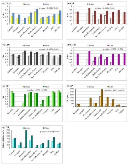 Bar charts showing values of crop production and diversification indices before and after implementing water harvesting interventions at 8 sites. (a) CLUI—cultivated land utilization index; (b) CPI—crop productivity index; (c) CDI—crop diversification index; (d) CWPI—crop water productivity index; (e) CFI—crop fertilization index; (f) GP—gross productivity; (g) GR—gross returns.