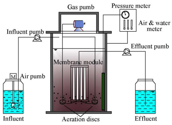 A schematic diagram of the SMBR is shown in Figure 1. The ceramic membrane was supplied by Ya’an Weclean Environmental Technology Co. (Ya’an, China). The ceramic membrane is made from α-Al2O3, it has a pore size of 0.1 μm and the membrane area is 0.125 m2/piece. The ceramic membrane has the advantages of a long service life, strong anti-fouling abilities, excellent hydrophilicity and a good oxidation resistance.