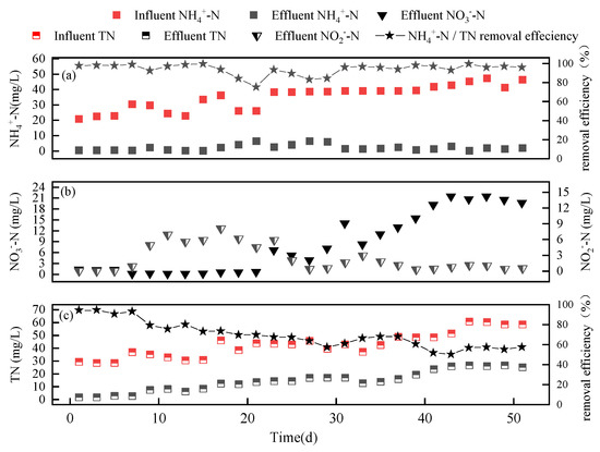 Performance of the SMBR for municipal sewage treatment in stage I. (a) NH4+−N, (b) NO3−−N and NO2−−N, (c) TN.