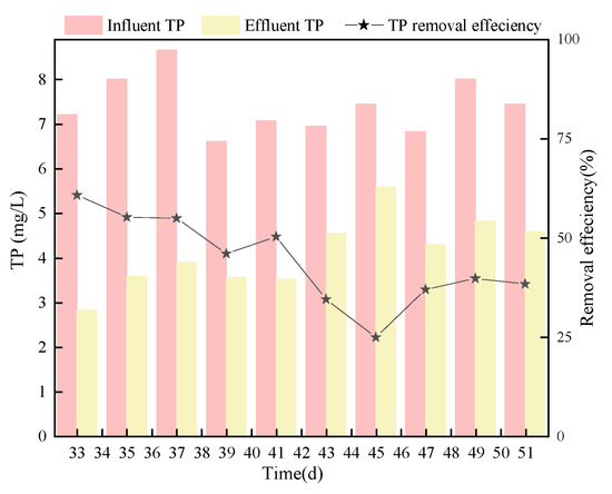 After a period of operation, the treatment effect of the SMBR on municipal sewage tended to be stable, and the TP removal rate was monitored (Figure 3). Initially, the removal rate of TP by the SMBR was more than 50%, which might be attributed to phosphate accumulating organisms (PAOs) and inorganic matter precipitation ingestion by suspended sludge [37]. From 41 to 51 d, the TP removal rate was maintained at about 40%. Song et al. [38] reported that the TP removal rate in SMBRs is less than 30% and Wang et al. [37] and Tiwari et al. [39] also reported that the TP removal rate of MBRs and SMBRs was about 30%. The main reason for the relatively low TP removal effect of SMBRs is that the adsorption of long SRT reaches saturation quickly and the real TP removal cannot be realized. Nguyen et al. stated that the MBR should facilitate the phosphorus accumulation process rather than the growth of PAO communities [40]. Therefore, SMBRs need to be combined with other phosphorus and nitrogen removal processes to achieve efficient TP removal.