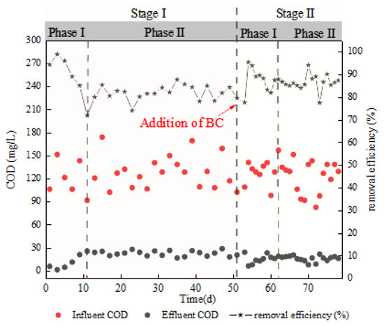 The performance of the SMBR was investigated with and without BC for the removal of COD (Figure 4). In stage I, COD was successfully removed in phase I with an average removal rate of 92.72% [41], which may be due to the breaking of the nutrient-poor environment in the start-up period. Nutrients in the actual wastewater promoted the growth of microorganisms in the system, thus improving the utilization rate of substrates [20]. During phase II (11~51 d), COD removal rates were above 70%, slightly lower than the results of Aslam et al. [42] and Sathya et al. [43], mainly because the municipal sewage used in this study contained industrial wastewater with substances that are difficult to degrade and have low biochemical properties. The average COD removal rate was 83.70% in stage I, indicating that the SMBR has a good effect on the treatment of actual municipal sewage.