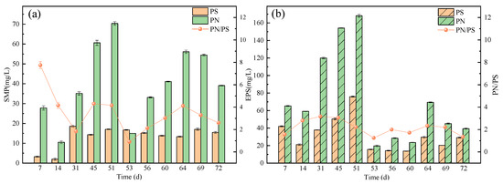 SMP and EPS contents in solution in the SMBR. PSs and PNs of (a) SMPs and (b) EPSs.