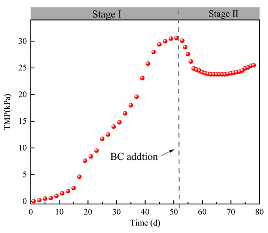 TMP profile of the effects of BC on membrane fouling process in the SMBR.
