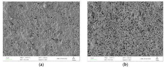The influence of BC on membrane fouling was studied through membrane surface characteristics, as shown in Figure 8. SEM of the contaminated membrane on the 51st day showed that the ceramic membrane was covered by a sludge layer and only a few membrane holes were visible (Figure 8a). At this point, TMPs reached the set value (>30 kPa), and a stable membrane effluent could not be maintained even under the pressure of the discharge pump, indicating that the membrane fouling of the SMBR has reached a maximum value. A large number of studies have reported that when the cake layer on the surface of the ceramic membrane is thick enough, the filtration resistance of the membrane will increase, resulting in an increase in TMPs [24,49,59]. In order to mitigate membrane fouling, BC was added. After 25 d of operation, the sludge layer clearly started to peel off, exposing the gel layer (Figure 8b), which was mainly composed of EPSs and SMPs [60]. This is consistent with the conclusion of Teng et al. [61] and Meng et al. [62], namely that the biofilm (cake layer) is mainly composed of a sludge cake layer and a gel layer, which together lead to membrane fouling. The results showed that BC can not only reduce the membrane fouling by changing the properties of the mixed liquor, but also reduce the thickness and compactness of the cake layer effectively by inhibiting the formation of the biofilm, improve the filtration performance of the ceramic membrane and reduce the resistance of the cake layer.
