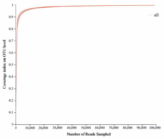 In addition to the properties of the mixed liquor, the microbial community also plays an important role in the membrane fouling [63]. Therefore, the α-diversity of the SMBR during operation was analyzed by high-throughput sequencing. The observed Good’s coverage rate of OTU was 99.62 ± 0.06%, and the rarefaction curves showed clear asymptotes (Figure 9), indicating that the sampling of this community was nearly complete [64].