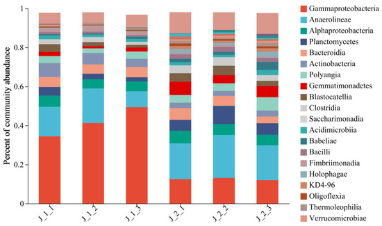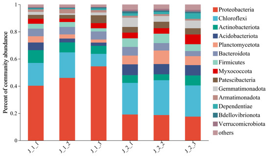 Microbial samples were collected at the end of the two stages and stored at −80 °C. The samples from the two stages in different regions of the system were suspended sludge, fixed sludge (located in the membrane module but not attached to the membrane) and cake layer sludge, named J_1_1, J_1_2, J_1_3, J_2_1, J_2_2 and J_2_3 in turn. After DNA extraction from the environmental samples, genomic DNA was evaluated by 1% agarose gel electrophoresis. Bacterial primers 515F (5′-GTGCCAGCMGCCGCGG-3′) and 806R (5′-GGACTACHVGGGTWTCTAAT-3′) were used to construct the PCR amplification library, and MiSeq sequencing was performed on the V4 region of the bacterial 16S rRNA gene. Sequencing was performed using Illumina’s Miseq PE300/NovaSeq PE250 platform (Shanghai Majorbio Biomedical Technology Co., Ltd., Shanghai, China). The sequencing data were analyzed using Meiji cloud platform. Sequence clustering with similarity ≥97% was in operational classification units (OTU). The community diversity index based on the OTU was obtained in the MOTHUR program [13].