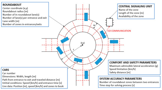 The system is illustrated in Figure 1 and is made of a network, e.g., roundabout, the users, e.g., vehicles, and a central signaling unit (CSU) able to manage the users in the network safely and optimally. The central signaling unit must know the position of each user in the network to manage them and be aware of interactions. It has been assumed in this study that all users of the network can communicate their positions to the central unit. This assumption is technically realistic as it is already possible to share real-time vehicle positions. However, it is still difficult to implement for competition and confidential issues [21].