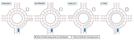 To simulate the system, a diversity of vehicles is created with random shapes, sizes, entries and exits, speeds, etc. for a given simulation. Once the vehicles have been randomly constituted, it is important to construct their path through the roundabout. Depending on the entry and exit, the path is drawn according to the conventions of the traffic regulation [29], as can be seen in Figure 2. Vehicles will know in which zones they should go through and will use their centers to locate their waypoints at each time step. A third order interpolation (Matlab function “3rd order polynomial”) is performed to determine the path to take between these waypoints depending on vehicle speed. The vehicle then evolves at each time step according to its speed and the waypoint’s location.