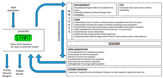 The communication-based vehicle control (CBVC) algorithm is following an object-oriented programming organization (Figure 3) [31]. It comprises a set of functions that are separated into blocks according to their functionalities. Objects are initialized due to different functions, as defined in Figure 4. All these objects are then fed to a solver, as described in Section 3.2. At the end of the solving process, the waypoints and speed profile of each vehicle will be extracted from the solver to create a graphical view of the driving scenario. Results such as vehicle crossing time, speed, consumption, and overall traffic flow can be plotted from the data obtained.