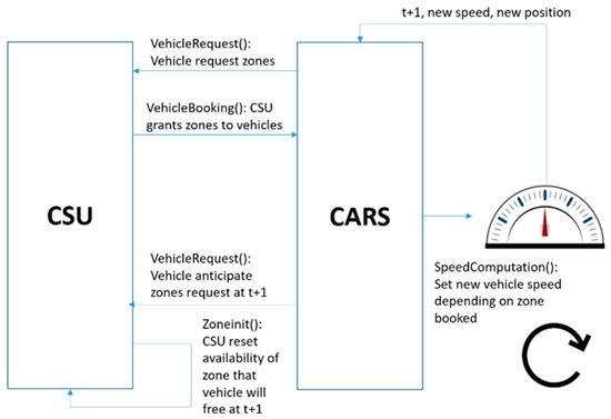 Working with a zoning strategy, the CSU will list all the zones of the roundabout and will stock each zones size, if they are available, and if not, which vehicle booked it. The vehicles in the roundabout make requests to the CSU to book the zones they desire, and the CSU replies with a movement authority. This way, the CSU has a global view of the network and acts as a flag for the movement of the vehicle. It acts as the infrastructure side in vehicle-to-infrastructure communication [27,28].