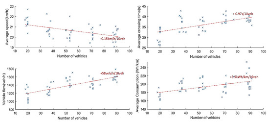 Figure 6. Average vehicle speed, crossing times, flow, and consumption depending on the number of vehicles. The crosses are points recorded during simulations whereas the red line is the linear trend of the recorded points.