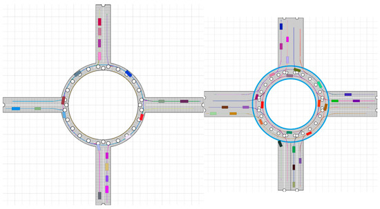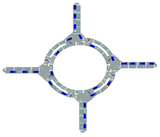 As depicted in Figure 5, the studied system is a four-entrance roundabout. The entrances/exits are simplified as straight, and the roundabout is assumed to be perfectly round. Apart from this, the roundabout parameters are completely tunable, such as:
