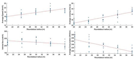 Figure 9. Average vehicle speed, crossing times, flow, and consumption depending on the roundabout radius. The crosses are points recorded during simulations whereas the red line is the linear trend of the recorded points.