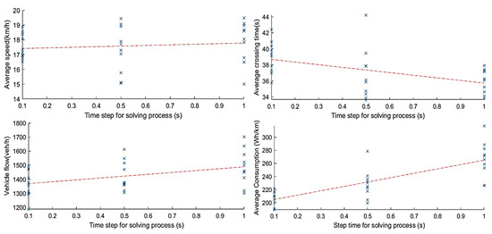 Figure 10. Average vehicle speed, crossing times, flow, and consumption depending on the time step for the solving process. The crosses are points recorded during simulations whereas the red line is the linear trend of the recorded points.