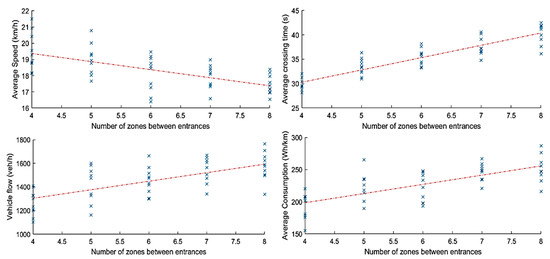 Figure 11. Average vehicle speed, crossing times, flow, and consumption depending on the number of zones between entrances. The crosses are points recorded during simulations whereas the red line is the linear trend of the recorded points.