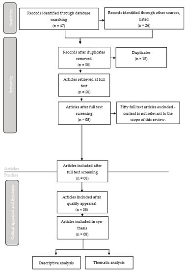 The 2018 Mixed Methods Appraisal Tool (MMAT) was used to assess the quality of the studies. MMAT is a validated tool that focuses on methodological quality criteria [37]. All (eight) publications were classified as being of high quality and thus included in the data extraction and analysis phase. The data were captured into an extraction template, synthesized, and analysed using thematic analysis to identify and critically examine emerging themes and subthemes in relation to the research question.