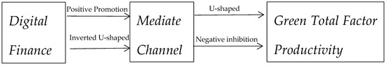 However, when digital finance development is low, GTFP may be inhibited. Digital finance can exacerbate resource mismatches through the digital divide. Firms also use digital finance for short-term speculation and arbitrage in virtual economy industries. These phenomena can be mitigated by improved digital infrastructure and coordination between digital technology and financial services [4,5]. In addition, the initial growth effects of digital finance have led to large amounts of pollutant emissions, which can be alleviated by enhancing energy-saving technologies [6]. Moreover, the positive environmental impacts of digital finance depend on specific digital infrastructure, and lower levels of digitization inhibit its emission-reducing effects [7]. Therefore, digital finance may have a U-shaped effect on GTFP.