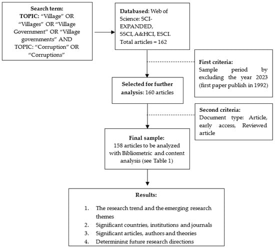 In the first section, we formulate research questions and research objectives that will guide the data collection and data analysis to answer these questions. The data collection through WOS starts by applying the keywords in the search field. In the first TOPIC field, we type “village” OR “villages” OR “village government” OR “village governments” to capture research related to village government. In the second TOPIC field, we type “corruption” OR “corruptions” to cover the study of corruption in villages. Figure 1 describes the data collection process, resulting in a final selection of 158 research articles.
