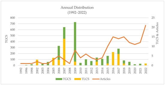Meanwhile, in the past seven years (2015 to 2022), there has been an increasing number of publications, with a total of 110 publications, averaging 13.75 publications per year. In 2015, ten articles were published, and since then, the research trend has been increasing, reaching its peak in 2022 with 21 publications. The increase in the average publication count from the period 1992–2014 to the period 2015–2022 can be attributed, in part, to Indonesia’s implementation of village decentralization in 2014. The first study was initiated to highlight the potential problems Indonesia would face with the implementation of decentralization at the village level [20].