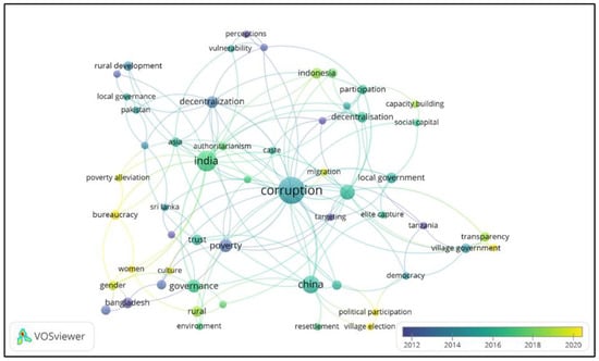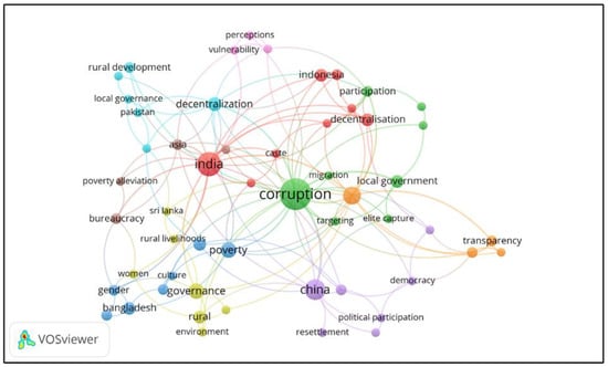 We ran a co-occurrence analysis using author keywords as the unit of analysis in VOSviewer to identify areas of and research directions for village corruption. The minimum co-occurrence of a keyword threshold was set at two (2), and out of a total 520 keywords, 57 met the threshold. In Figure 3, we can see that seven countries emerge from the highest to the lowest occurrences, i.e., India (n = 15), China (n = 11), Africa (Tanzania, West Africa and Africa) (n = 6), Bangladesh (n = 4), Indonesia (n = 4), Sri Lanka (n = 2) and Pakistan (n = 2). The topics were dominated by “accountability” (n = 8), “poverty” (n = 6), “governance” (n = 6), “decentralization” (n = 5) and “trust” (n = 4). Since the village corruption research is still spread across various fields of study, nine clusters emerged with the theme that were not concentrated or appeared to be random.