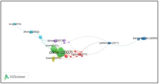 Therefore, as shown in Figure 4, we performed bibliographic coupling based on the document to point out the research theme cluster, with the minimum number of citations set to 10. Out of 158 articles, 54 met the threshold. The results show that the village corruption topic was grouped into six clusters, and to identify the theme of each cluster, we conducted content analysis. The first cluster (red color) is focused on “politician and people empowerment”. The second cluster (green color) revolves around “decentralization and management”. The third cluster (blue color) is centered on “natural conservation” (wildlife, forest), while the fourth (yellow color) explores “human resources and culture”, the fifth (purple color) delves into “disaster and health”, and the sixth and last cluster (light blue) addresses “corruption in China”. The clustering demonstrates how similar themes or issues in the research are grouped together. Subsequently, we conducted content analysis to confirm the research fields and clusters of the research. We identified five major research fields: “politics”, “economics”, “accounting”, “management” and “information technology” (Table 3).