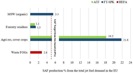 According to Table 1, the availability of waste FOGs, agricultural residues, cover crops, and forestry residuals that are used in the bio-sector is expected to increase in 2050 compared to 2030. However, it is anticipated that the organic fraction of municipal solid waste will decrease by 2050 due to the EU’s regulations aimed at reducing its production by following the waste hierarchy scheme [25]. The main focus is on the actual feedstocks, as those are the ones that are available and could be easily utilized to produce SAF. It can be seen that agriculture residuals, cover crops, and MSW would be largely available compared to forestry residuals.