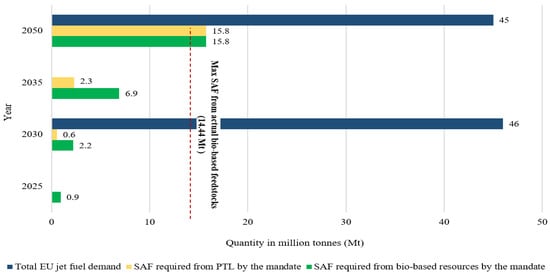 The European Union (EU) has been taking steps to lower aviation emissions by promoting the use of sustainable aviation fuel as a solution to decarbonize the sector [8,9,10]. In 2021, the EU Commission proposed to gradually increase the share of SAF at EU airports. Therefore, the ReFuelEU aviation initiative is meant to introduce a SAF mandate. On the 26th of April 2023, the EU parliament and the EU council reached a new agreement to increase the SAF uptake compared to what was originally proposed by the European Commission [11]. The agreed SAF uplift at EU airports will be as follows: 2% by 2025, 6% by 2030, and 20% by 2035, up to a maximum of 70% by 2050. Out of these amounts, 1.2% in 2030 and 5% in 2035, increasing to 35% by 2050, will be produced through power to liquid (PTL). The PTL process involves converting renewable electricity generated from solar or wind power to produce liquid fuels that can be used as alternatives to conventional jet fuel. The SAF uptake in the EU is projected to increase steadily from 2025 to 2035 as more SAF plants are commissioned and moved towards their full capcity after a few years of operation. As the SAF market matures, it is anticipated that more plants will be able to reach their full capacity more rapidly, and the costs of producing SAF will also decrease, resulting in an exponential uptake trajectory from 2035 to 2050. Having such a mandate has a lot of advantages, starting with boosting the demand for SAF, which stimulates the domestic economy, creates more opportunities, and expands the infrastructure required to meet the targets. Moreover, such a mandate gives confidence to investors and stakeholders to support the research and development (R&D) and commercialization of new SAF technologies. The new mandate will be based on a volumetric scheme. Therefore, the airlines will be required to use a specific amount of SAF based on the volume of fuel they consume. This differs from the GHG scheme, which sets a limit on the amount of carbon emissions that airlines are allowed to produce and requires them to offset any emissions above this limit. However, the EU has set guidelines to assure that the SAF is sustainably produced and does not possess a negative social or environmental impact. Therefore, after the new modifications that were introduced to the European SAF mandate, a need emerged for a detailed study to address the potential of meeting the new SAF targets and assess the feasibility of achieving such projections. Therefore, this paper aims to address this issue based on the currently available technologies and bio-based feedstocks.