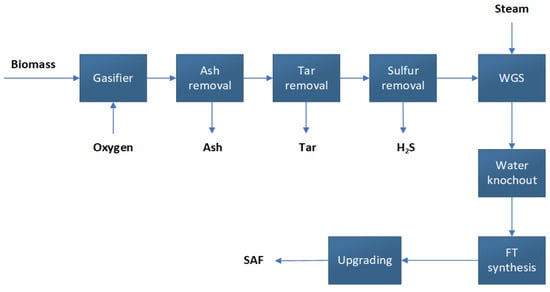 A process model was developed to simulate the process on a large scale, as shown in Figure 4. This model relied on experimental data for the gasification and the Fischer–Tropsch section while scaling up the model using commercial operating conditions [44,45,46]. The input values utilized in this model were obtained from the BIOFMET project, which provided comprehensive data regarding the moisture content of the biomass, the calorific value, and the CHNS composition [47]. ASPEN Plus V10 was used to simulate the process and calculate the material and energy balances of the process streams. The Peng–Robinson equation of state in combination with the Boston–Mathias was used as a property method. Oxygen gasification was selected as the air separation unit produces nitrogen-free syngas, which is better suited for the Fischer–Tropsch process. Fischer–Tropsch can be performed at low or high temperatures. For the synthesis of long-chain hydrocarbons, low-temperature FT is recommended. The basic case of the model uses a closed-loop design for the FT reactor to maximize the CO conversion, which leads to a higher SAF yield. The scale of the model was set at around 1 GW, which is equivalent to a feed rate of around 300 tonnes/h of biomass.