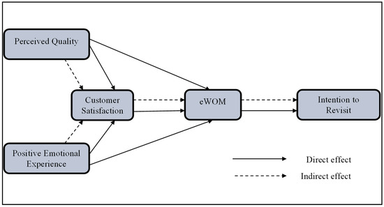 In terms of the indirect relationship between PQ, PEE, CS, and ITR through the intermediating role of eWOM, this is still under study, particularly in the hotel industry context. In accordance with the prior conclusions that revealed the significant effect of PQ, PEE, and CS on customer-positive eWOM [13,15,33] and the substantial positive effect of eWOM on ITR [17,67], it could be assumed that eWOM is more likely to play a vital intermediating role in the PQ–ITR, PEE–ITR, and CS–ITR relationships. More specifically, in accordance with the S-O-R model, the higher perceived quality, the more positive emotional experience, and the higher satisfaction (S) are more likely to lead to highly positive eWOM intention (O), which in turn may significantly positively affect customers’ ITR (R). Hence, the following hypotheses should be examined: