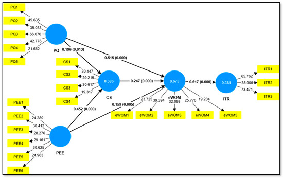 Concerning the direct paths, the study findings displayed in Table 6 and Figure 2 revealed that there was a significant positive impact of PQ on intention to positive eWOM (represented by β = 0.515, t-value = 9.397, p < 0.001), which lends support to hypothesis 1. Further, results also demonstrated that both PEE and CS significantly contributed to enhancing customers’ eWOM intention, as indicated by the β values of 0.159 and 0.247, respectively. These findings support the acceptance of hypotheses 2 and 3. In terms of the effect of PQ and PEE on CS, results indicated that both significantly positively affected CS (represented by β = 0.196, t-value = 2.474, p < 0.05; β = 0.452, t-value = 5.371, p < 0.001), supporting hypotheses 4 and 6. Similarly, the study results supported H8, which assumed that eWOM significantly positively affects ITR (β = 0.617, t-value = 18.098, p < 0.001).