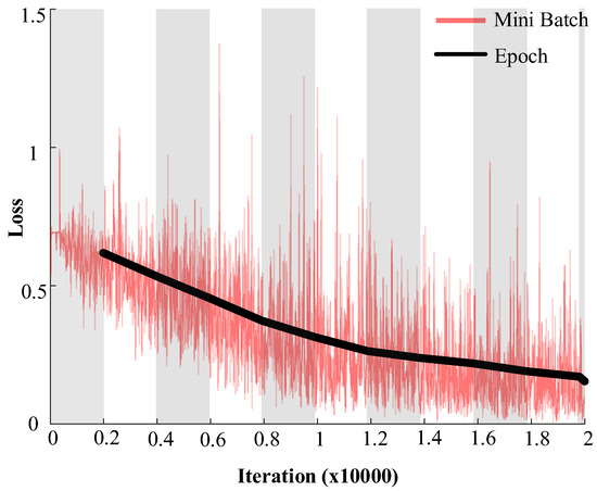 SN-1 is the first network trained with the Omniglot dataset in our simulation. It is important that this network is well trained. Since the CNN in the SN is trained in this part, its parameters are fixed during all the test stages. The hyperparameters of the SN are chosen by a trial-and-error method. Since there is no systemic method to choose these parameters. However, the inner parameter of the FCNN can be changed during the testing process because each new incoming data causes the behavior of the system to change. For the network to adapt to the latest data, the network structure is prepared for the following classification process by training it again partially with new data. The training process of the network SN-1 with the Omniglot dataset can be seen in Figure 6. Training has been continued for ten epochs, with 2 K iterations.